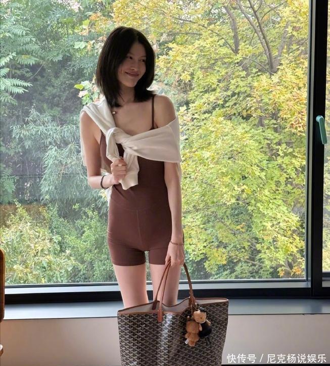 在照片中我们看到何穗穿了一身褐色的连体瑜伽服,加上白色的围巾当点缀,披肩发整体上看上去很温柔,最让人注意的还是何穗完美的身材。
